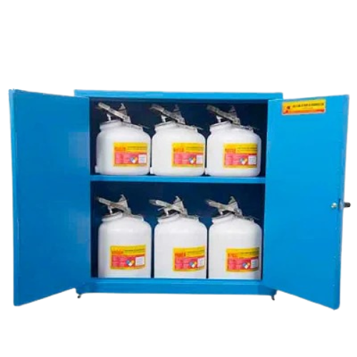 Pintado na cor Azul (blue) para estocagem de ácidos (storage de acids).Cor característica do armário corta fogo para liquido corrosivo, armários corta chama para corrosivos ,ácidos, álcalis etc.
